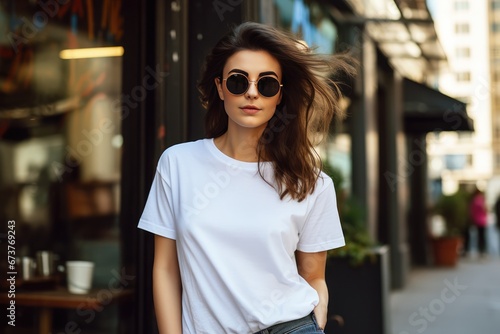 Hipster Girl Wearing Blank White Tshirt And Jeans At Cafe