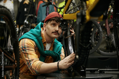 young, hipster, man, selecting, new, mountain, bike, shop, male, client, looking, wheel, tire, tread, spoke, placement, bicycle, store, retail, choice, equipment, adult, person, client, indoor, mechanic, sale, service, choosing, buying, transportation, activity, examining, tied-up, occupation, purchasing, sport, cheerful, buy, decision, selection, consumerism, people, biking, bicyclist, transport, cycle, buyer