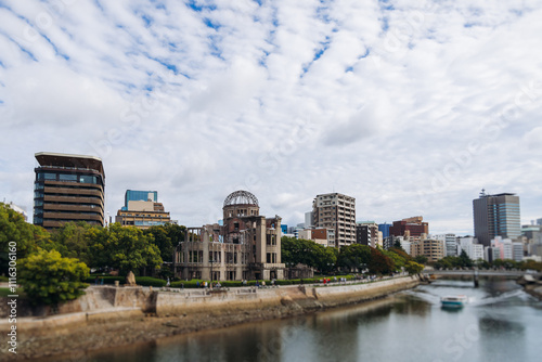 Hiroshima, skyline city view with Atomic Bomb Dome, Peace memorial park with A-Bomb Genbaku Dome, Hiroshima prefecture, Japan, in a sunny fall autumn day