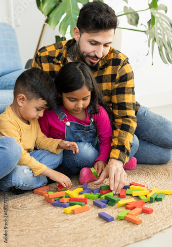 Hispanic father playing with his little children on carpet at home