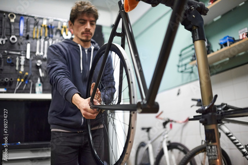Hispanic man evaluating the alignment of the rear wheel of a bicycle he is servicing in his workshop. Real people at work.