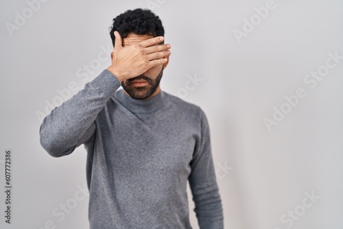 Hispanic man with beard standing over white background covering eyes with hand, looking serious and sad. sightless, hiding and rejection concept