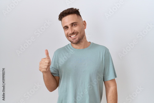 approving, background, beard, doing, gesture, hand, happy, hispanic, looking, man, showing, standing, success, thumb, up, white, adult, approve, casual attire, cheerful, confident, photogenic, latin, like, male, ok, ok, people, person, portrait, positive, right, signs, smile, smiling, racked, studio, successful, t-shirt, teeth, thumb, thumb up, trust, wearing, winner, young