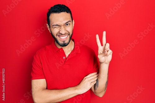 Hispanic man with beard wearing casual red t shirt smiling with happy face winking at the camera doing victory sign. number two.