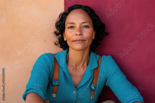 hispanic, mature, female, blue, wall, woman, adult, curly, hair, portrait, confident, expression, casual attire, clothing, relaxed, demeanor, sitting, pose, colourful, background, vibrant, texture, profile, smile, outdoors, natural, light, composition, detail, attire, fashion, style, personality, comfortable, look, candid, face, aesthetic, simplicity, earring, elegance, contemplation, setting, ambience