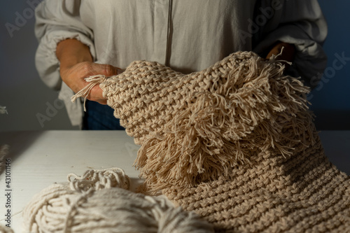 Hispanic senior woman holding a handmade fabric in her workshop - latinx