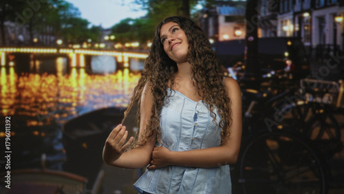 woman, hair, touching, street, hispanic, teenage, canal, girl, bridge, night, serenity, smile, curly, sleeveless, blue, light, building, young, pose, gesture, gaze, evening, city, urban, lamp, glow, sparkle, casual attire, denim, summer, leisure, travel, vacation, candid, composition, scenic, twilight, nightlife, bokeh, shimmer, natural, expression, bicycle, buttons, detail, youth, neckline, seam