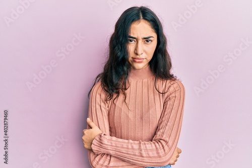 Hispanic teenager girl with dental braces wearing casual clothes skeptic and nervous, disapproving expression on face with crossed arms. negative person.