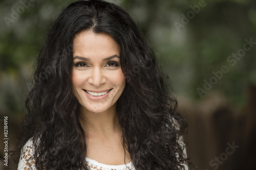 beauty, black hair, closeup, color image, confident, copy space, curly hair, day, femininity, happy, horizontal, latina, long hair, nature, one person, outdoors, people, photo, portrait, posing, smiling, woman