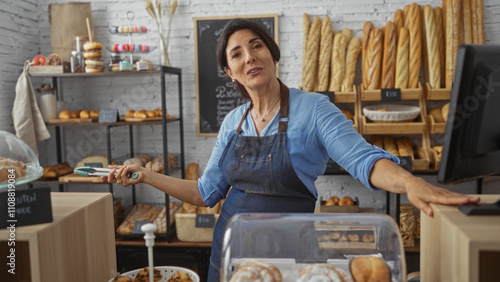 hispanic, woman, bakery, shop, working, apron, bread, pastry, indoor, interior, baker, counter, display, selling, business, client, sale, occupation, service, friendly, employee, baking, retail, store, artisan, smiling, curly, flour, chef, professional, culinary, bread, cake, food, healthy, epicure, fresh, homemade, traditional, kneading, oven, tasty, shopkeeper, tongs, product, parchment