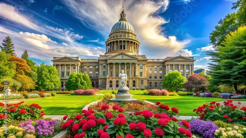 Historic Idaho State Capitol building in Boise, Idaho, with its stunning dome and neoclassical architecture, surrounded by lush greenery and vibrant flowers.