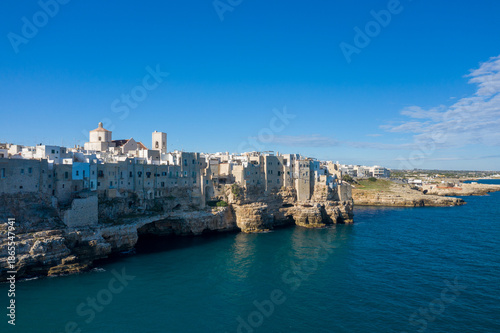 Historic whitewashed buildings cluster atop rugged limestone cliffs overlooking the deep blue Adriatic Sea in Polignano a Mare, Apulia, Italy. The scene is defined by dramatic coastal architecture