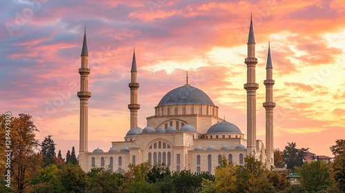 Historical Mosque Under Colorful Sunset Sky With Dramatic Clouds and Silhouetted Spires Surrounded by Green Trees in the Evening Cityscape