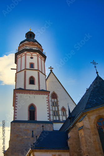 Historische Thomaskirche in Leipzig bei strahlendem Sonnenschein, Wirkungsstätte von Johann Sebastian Bach unter blauem Himmel, Sachsen, Deutschland