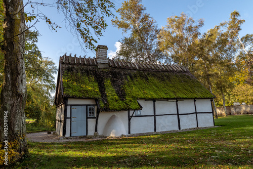 Historisches Fachwerkhaus mit moosbedecktem Dach bei Stevns Klint