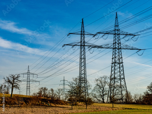 Hochspannungsmasten einer Überlandleitung im Feld