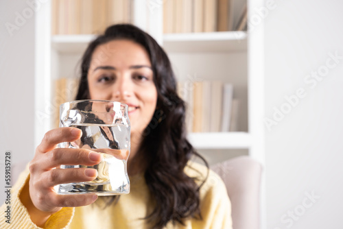 Holding glass of water, close up selective focus on woman holding glass of water. Showing and recommending pure mineral water, copy space. Healthy lifestyle health care concept idea. Refreshment habit