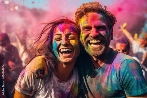 Holi festival. women and men in paint are smiling. cheerful young multiethnic friends with colorful paint on clothes and bodies having fun together at holi festival. generative ai.