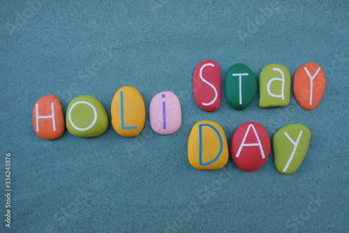 Holi stay or Holiday text composed with multi colored stone letters over green sand
