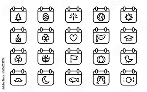 vector, icon, holiday, event, calendar, celebration, special, date, christmas, easter, fireworks, earth, star, candle, clover, nubes, mask, graduation, pumpkin, bird, moustache, moon, fish, champaign, exclamation, party, festival, season, occasion, planner, schedule, line, outline, simple, clean, minimalist, set, kit, pack, collection, element, graphic, template, editable, illustration, artwork, creative