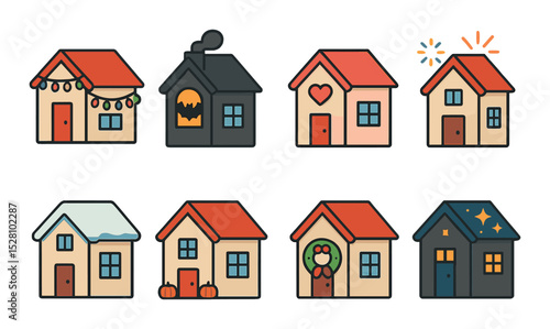 holiday, decorated, house, house, christmas, light, skittish, halloween, set, vector, nubes, fireworks, snow, isometric, flat, covered, roof, pumpkin, porch, festive, chaplet, starry, night, home