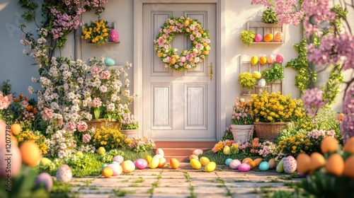 Holiday Easter wreath with festive eggs and spring flowers on front door, celebrating spring and easter, pastel colors decorations