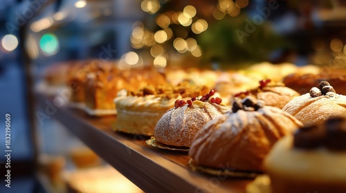 Holiday pastry display, elegant bakery counter, blurred festive lights
