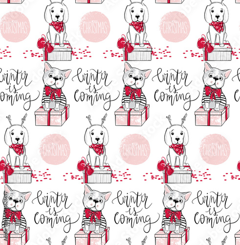 Holidays seamless pattern with funny dog. Happy new year pets. M