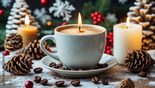 Holiday-themed arrangement with a mug of coffee, pine cones, and a lit candle