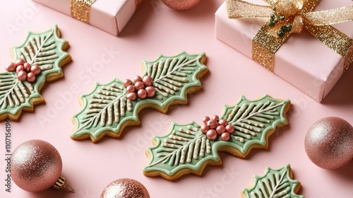 Holly leaf cookies, decorated with textured green icing and shiny red candy berries, arranged alongside Christmas ornaments and gift boxes