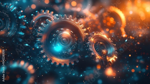 Holographic gears and chrome cogs in a deep space background with glowing light trails