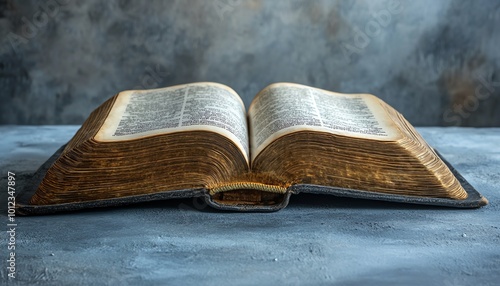 Holy book open on a grey surface with ample copy space, providing a clean background for spiritual or religious content