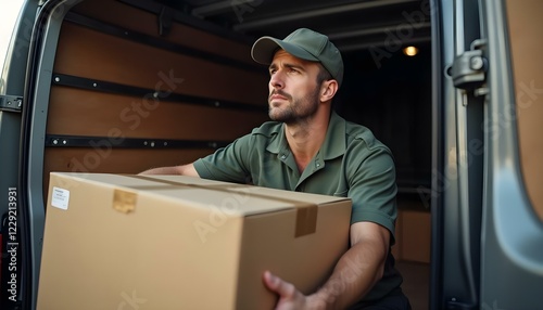 Hombre repartidor vestido de uniforme, cargando cajas de cartón en su furgoneta