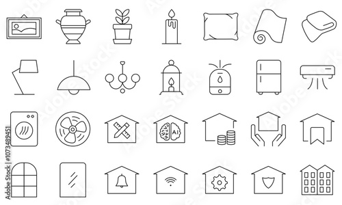 home, decor, interior, design, furniture, minimalist, modern, stylish, icon, set, collection, cosy, living, room, lamp, pendant, light, chair, sofa, table, bedchamber, kitchen, wall, artwork, plant, vase, candle, mirror, carpet, rug, minimal, flat, clean, simple, outline, symbol, luxury, comfort, lifestyle, trend, illustration, decorate, space, apartment, house, real estate, classic, warm, elegant