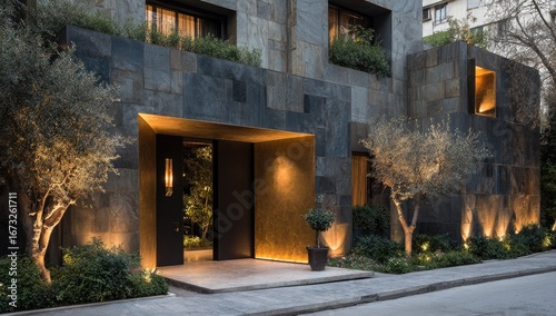 house, building, architecture, exterior, design, modern, facades, entrance, door, stone, tree, plant, light, lighting, residential, home, property, style, contemporary, urban, structure, wall, art, artistic, evening, illuminated, elegant, luxurious, expensive, beautiful, scenic, landscape, view, scene, day, nature, bright, shadow, texture, material, decor, ground, path, front, gateway
