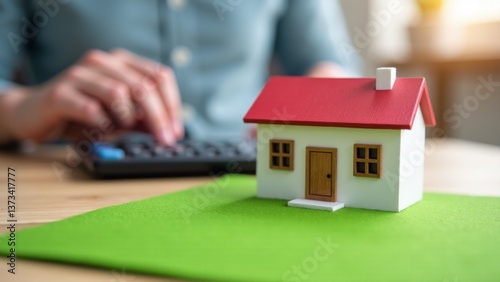 home, house, model house, real estate, mortgage, property, finance, investment, calculating machine, accounting, budgeting, saving money, home buying, purchase, person, hand, red roof, table, closeup, business, economy, tax, wealth, insurance, asset, domestic life, future, planning, loan, interest rate, ownership, housing market, appraisal, risk, security, family, indoor, minimalist, studio shot, wooden table