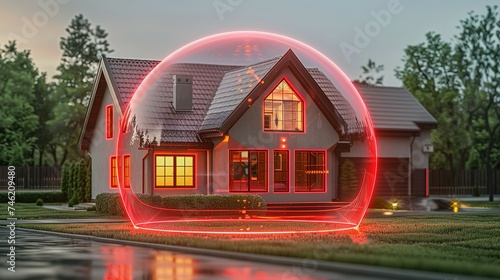 home protected by an alarm system in the form of a red dome around the house