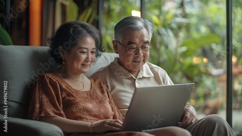 Home relax and senior couple with laptop on sofa for online travel booking information and decision Man woman and love with tech in living room for trip plan web registration and readi : Generative AI