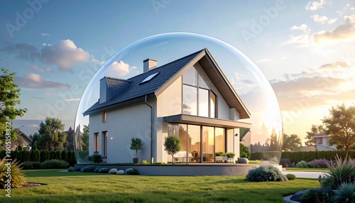Home Safety and Protection Concept Showing Modern House Inside Protective Dome, Wide Angle View, Peaceful Natural Surroundings