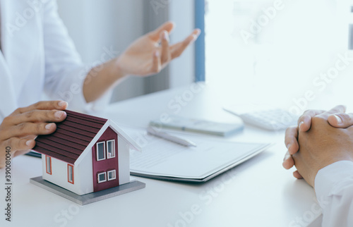 Home salesman explains the terms of buying a home to customers who need accommodation.