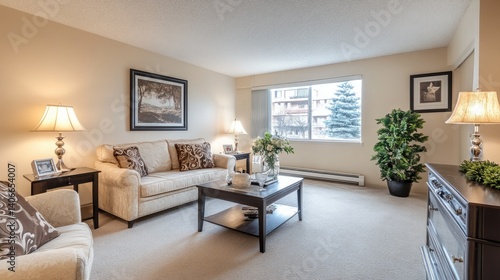 Home staging scene featuring living room with soft lighting and stylish decor