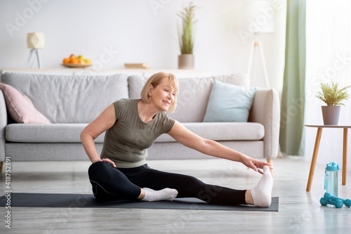 Home workout. Sporty senior lady stretching her leg on yoga mat in living room, copy space