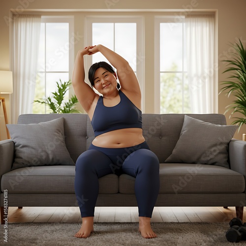 woman, stretching, exercise, fitness, healthy, home, sofa, couch, living room, indoor, yoga, pilates, physical exercise, active, lifestyle, well-being, body, positive, happy, smiling, seated, comfortable, relaxed, athletic, apparel, clothing, leg, arm, posture, wellness, weight