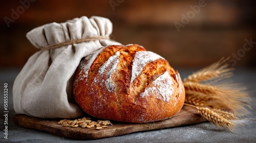 Homemade artisan bread and burlap sack with wheat on rustic table