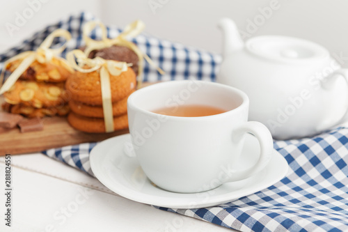 tea, cookie, cup, sugar, background, beverage, black, breakfast, brown, ceramic, drink, hot, napkin, plate, sweet, white, wood, biscuit, board, cake, calorie, closeup, hot drink, cover, delicious, dessert, food, fresh, grey, alimentary, oatmeal, pastry, snack, table, tasty, vegetarian, wallpaper, pot, top, view, morning, overhead