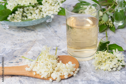 Homemade elderflower drink with sugar and lemon in a glass, light background