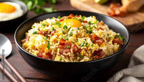 Homemade Fried Rice With Bacon And Egg In A Bowl, Side View.
