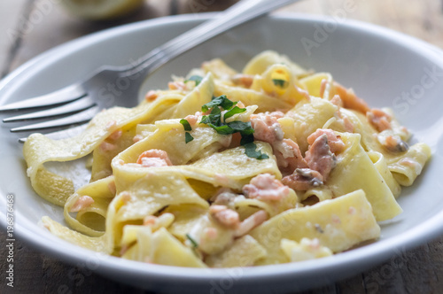 Homemade italian pasta with smoked salmone and creamy sauce and parsley on the top, white plate on the wooden rustic table