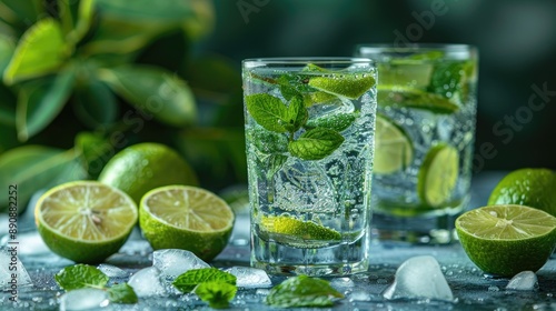lime, mint, glasses, copy space, ice cube, cold drink, drink, cocktail, green, water, mojito, ice, cold, alcohol, lemon, isolated, white, beverage, juice, fruit, freshness, leaf, lemonade, fresh, soda, summer, refreshment, cool