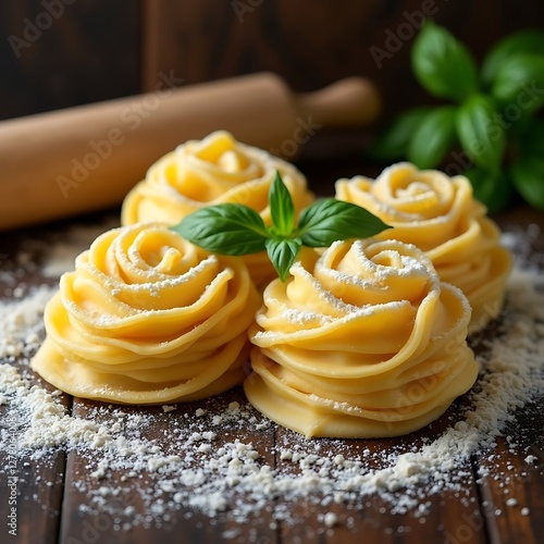 Homemade Pasta Nests with Flour, Basil, and Rolling Pin on Rustic Dark Wood Background – Traditional Italian Kitchen